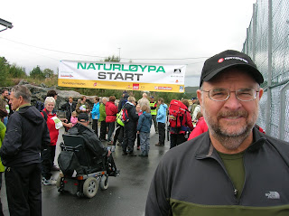 The weekend was nicer than recent weather. Good news for the Knarvikmila, which has runs from a half-marathon down to 5K, and nature walks through the forest and up the hills. Ed and I signed up for the 7.5K nature walk. You see from the sky in the picture that my idea of nice weather has changed from what it used to be in Phoenix. It was 12 C or 54 F on a thermometer along the way, and it had just finished raining. Perfect weather for hiking!